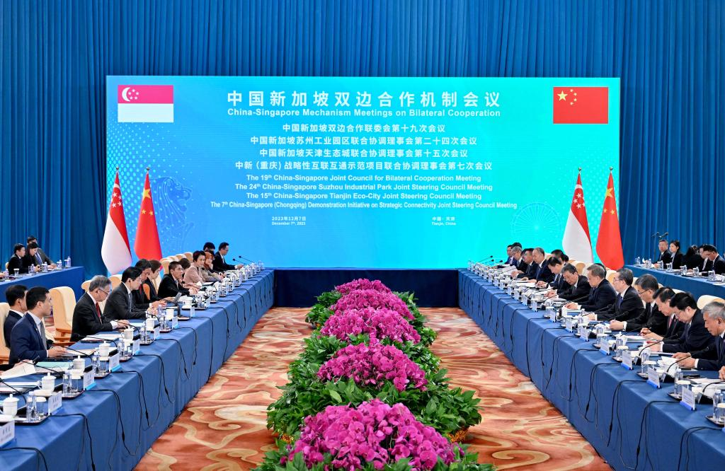 Ding Xuexiang, member of the Standing Committee of the Political Bureau of the Communist Party of China Central Committee and vice premier of the State Council, co-chairs the China-Singapore Mechanism Meetings on Bilateral Cooperation with Deputy Prime Minister and Minister for Finance of the Republic of Singapore Lawrence Wong in Tianjin, north China, Dec. 7, 2023. Ding and Wong co-chaired the 19th meeting of the China-Singapore Joint Council for Bilateral Cooperation, the 24th meeting of China-Singapore Suzhou Industrial Park Joint Steering Council (JSC), the 15th meeting of the China-Singapore Tianjin Eco-City JSC and the seventh meeting of the China-Singapore (Chongqing) Demonstration Initiative on Strategic Connectivity JSC. (Xinhua/Yue Yuewei)