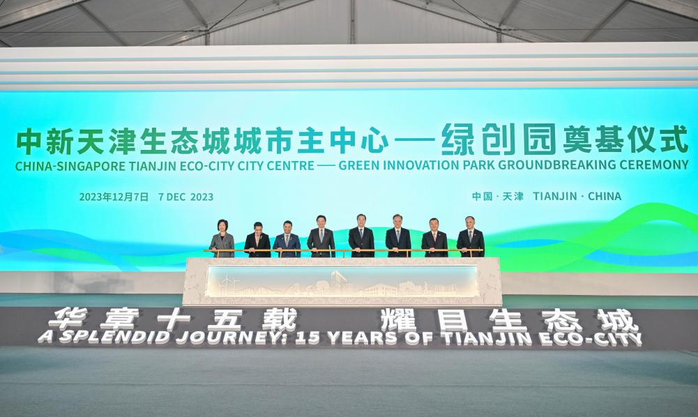 Ding Xuexiang, member of the Standing Committee of the Political Bureau of the Communist Party of China Central Committee and vice premier of the State Council, attends the China-Singapore Tianjin Eco-City City Centre -- Green Innovation Park Groundbreaking Ceremony with Deputy Prime Minister and Minister for Finance of the Republic of Singapore Lawrence Wong in Tianjin, north China, Dec. 7, 2023. Ding and Wong co-chaired the 19th meeting of the China-Singapore Joint Council for Bilateral Cooperation, the 24th meeting of China-Singapore Suzhou Industrial Park Joint Steering Council (JSC), the 15th meeting of the China-Singapore Tianjin Eco-City JSC and the seventh meeting of the China-Singapore (Chongqing) Demonstration Initiative on Strategic Connectivity JSC. (Xinhua/Yue Yuewei)