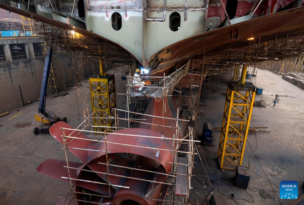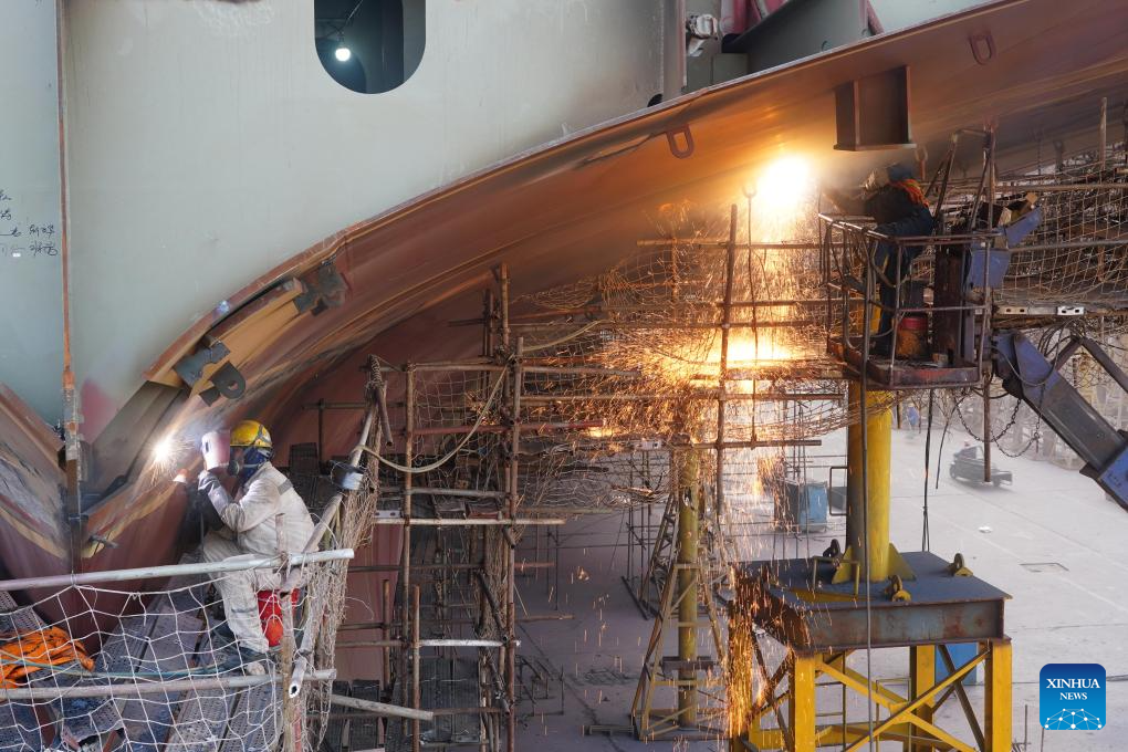 Workers work in a shipyard of Jiangsu Yangzi Xinfu Shipbuilding Co., Ltd. in Taixing, east China's Jiangsu Province, Dec. 5, 2023.