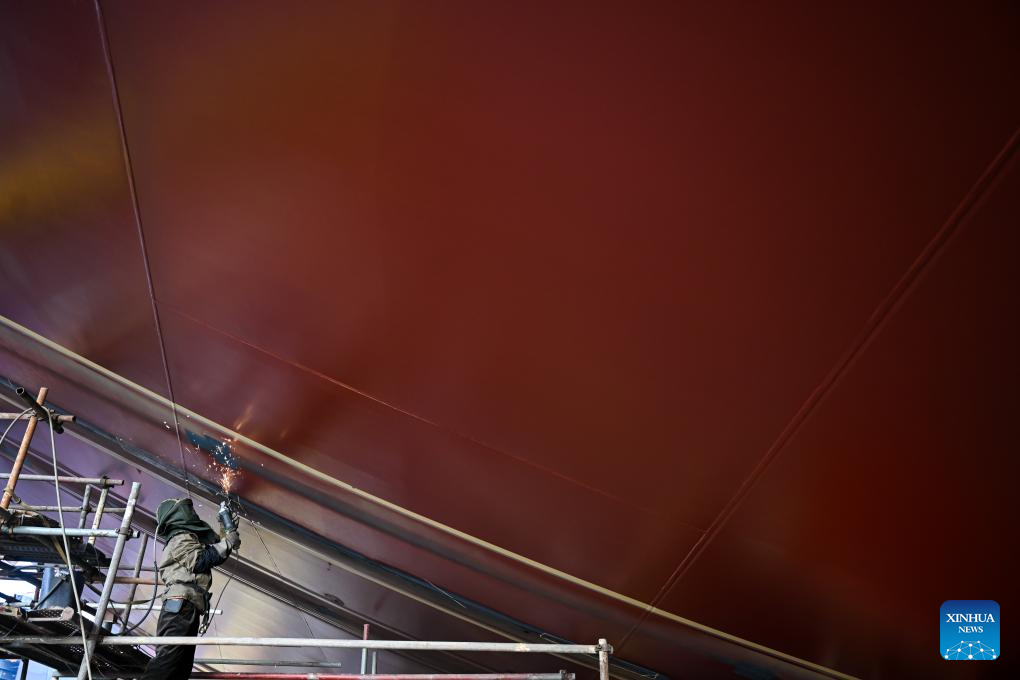 A worker works at a shipyard of Jiangsu Yangzi Xinfu Shipbuilding Co., Ltd. in Taixing, east China's Jiangsu Province, Dec. 5, 2023.