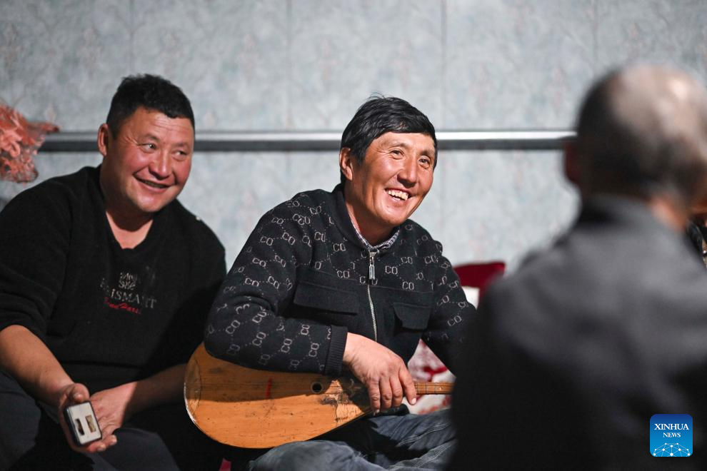 Habudelashen Nusupbek (C) plays dombra and sings during a gathering in Yumin County, northwest China's Xinjiang Uygur Autonomous Region, Nov. 30, 2023. (Xinhua/Hu Huhu)