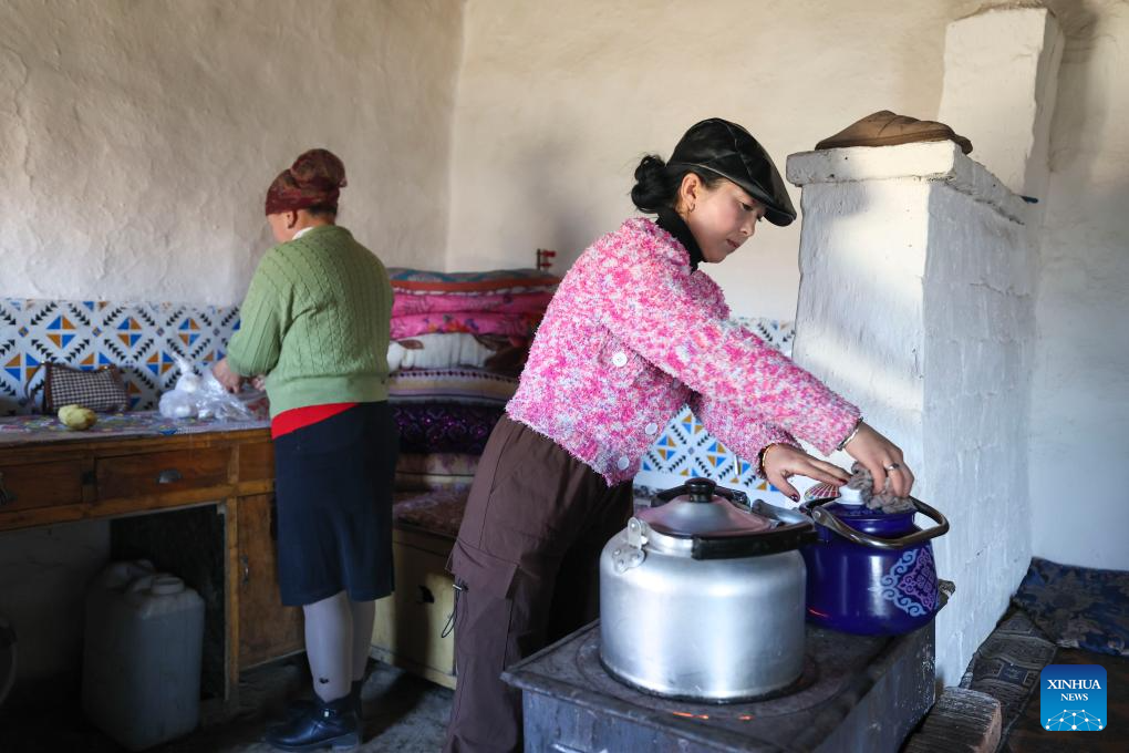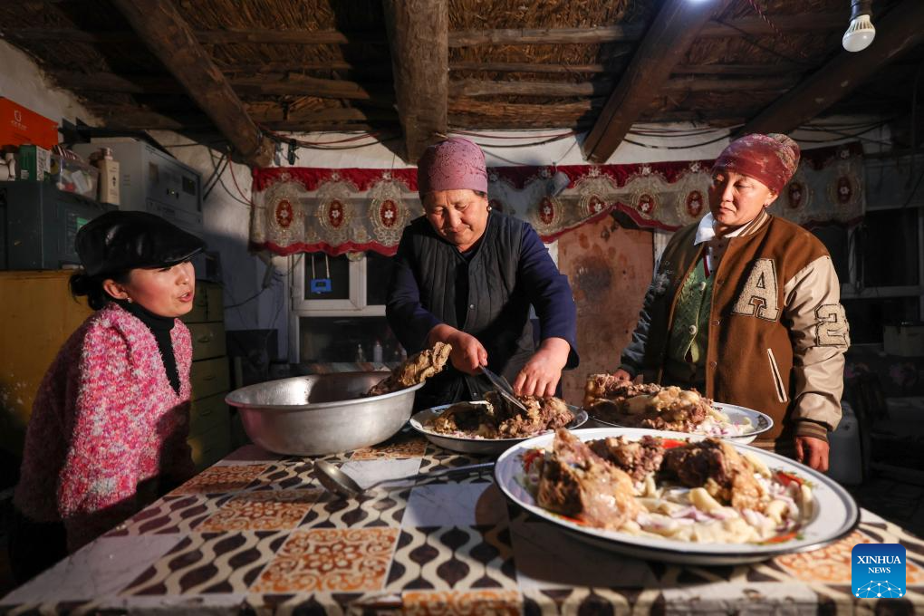 Baht's eldest daughter (R) and sister-in-law prepare food for guests in Yumin County, northwest China's Xinjiang Uygur Autonomous Region, Nov. 30, 2023. (Xinhua/Hu Huhu)