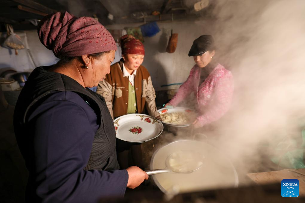 Baht (L) prepares to serve guests noodles with her eldest daughter and sister-in-law (C) in Yumin County, northwest China's Xinjiang Uygur Autonomous Region, Nov. 30, 2023. (Xinhua/Hu Huhu)