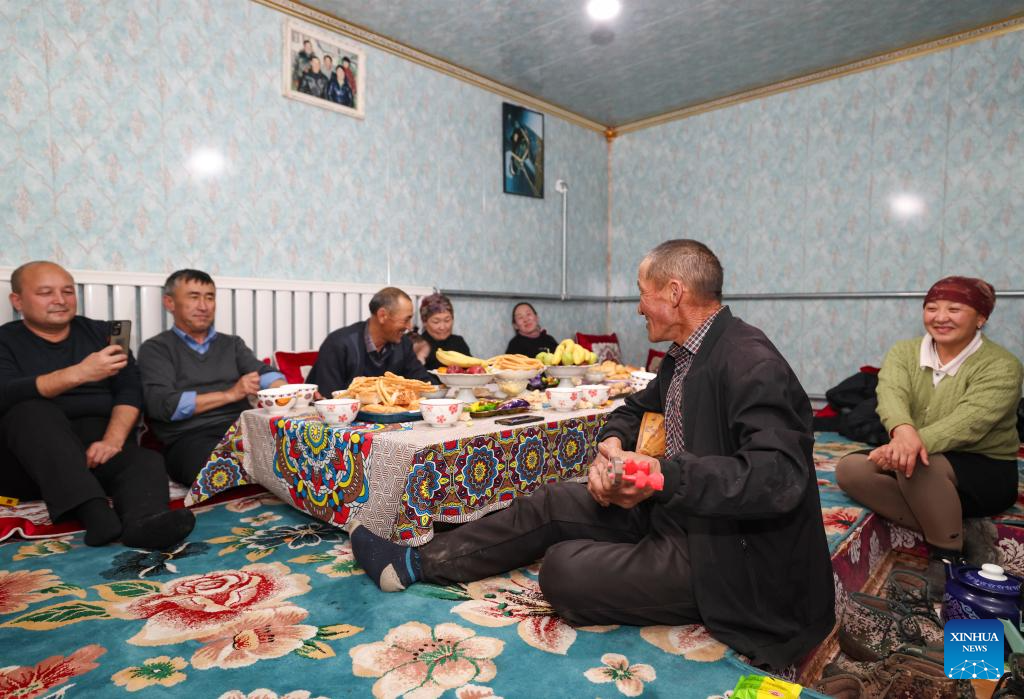 Relatives of Baht chat and sing during a gathering in Yumin County, northwest China's Xinjiang Uygur Autonomous Region, Nov. 30, 2023. (Xinhua/Hu Huhu)