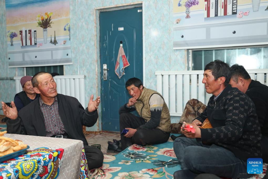 Baht's brother (1st R) plays dombra and sings a song praising the pasture in Yumin County, northwest China's Xinjiang Uygur Autonomous Region, Nov. 30, 2023. (Xinhua/Hu Huhu)
