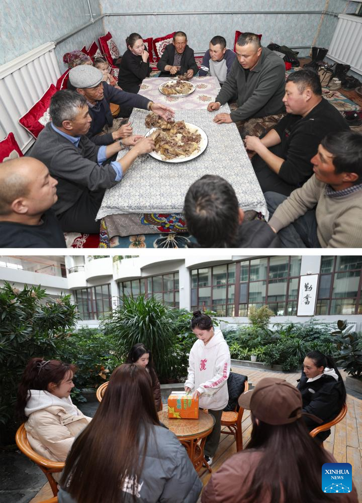 This combo photo shows guests eating steamed beef at Baht's home in Yumin County on Nov. 30, 2023 (above) and Baht's youngest daughter sharing foods sent by her mother with her friends at Xinjiang Medical University on Dec. 3, 2023 (bottom) in northwest China's Xinjiang Uygur Autonomous Region. (Xinhua/Hu Huhu)