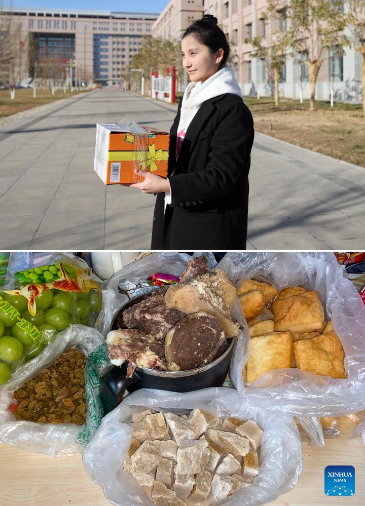 This combo photo shows Baht's youngest daughter with the package sent by Baht at Xinjiang Medical University in northwest China's Xinjiang Uygur Autonomous Region on Dec. 3, 2023 (above, photo taken by Xinhua photographer Hu Huhu) and the foods in the package (bottom, photo taken on Dec. 3, 2023). (Xinhua)