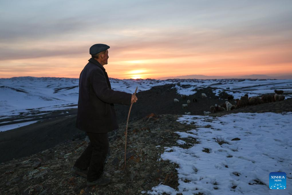 Habudelashen Nusupbek waits for the sheep's return after grazing in Yumin County, northwest China's Xinjiang Uygur Autonomous Region, Nov. 30, 2023. (Xinhua/Hu Huhu)