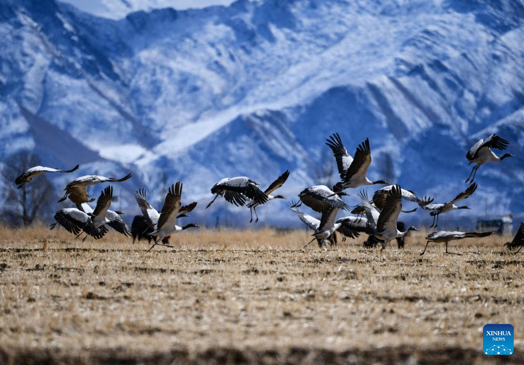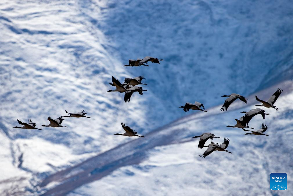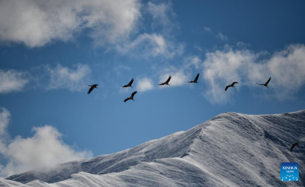 This photo taken on Dec. 8, 2023 shows black-necked cranes flying past snow-covered mountains in Lhasa, southwest China's Xizang Autonomous Region. (Xinhua/Jiang Fan)