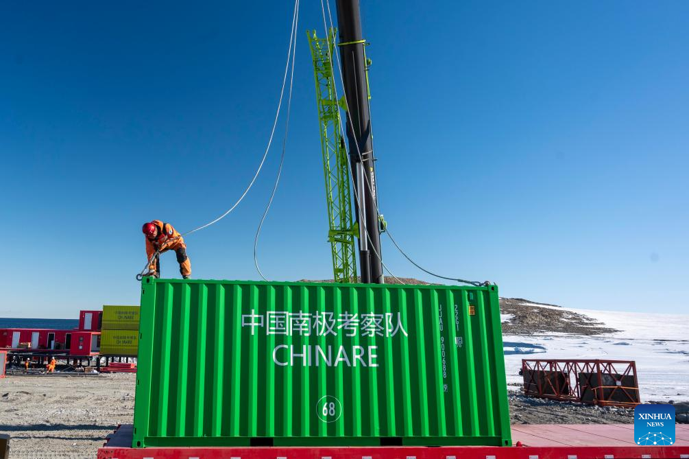 A member of China's 40th Antarctic expedition team unloads a container along the coastal areas of the Ross Sea, Dec. 10, 2023. A new scientific research station will be established along the coastal areas of the Ross Sea during this expedition, becoming China's fifth research station in Antarctica and the third permanent ones, after the Changcheng and Zhongshan stations. (Xinhua/Zhou Yuan)