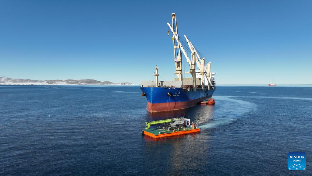 This aerial photo taken on Dec. 8, 2023 shows cargo vessel Tian Hui unloading supplies near the coastal areas of the Ross Sea. A new scientific research station will be established along the coastal areas of the Ross Sea during this expedition, becoming China's fifth research station in Antarctica and the third permanent ones, after the Changcheng and Zhongshan stations. (Photo by Wang Hainan/Xinhua)