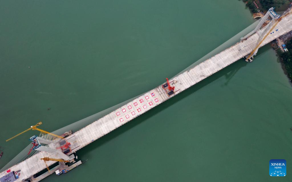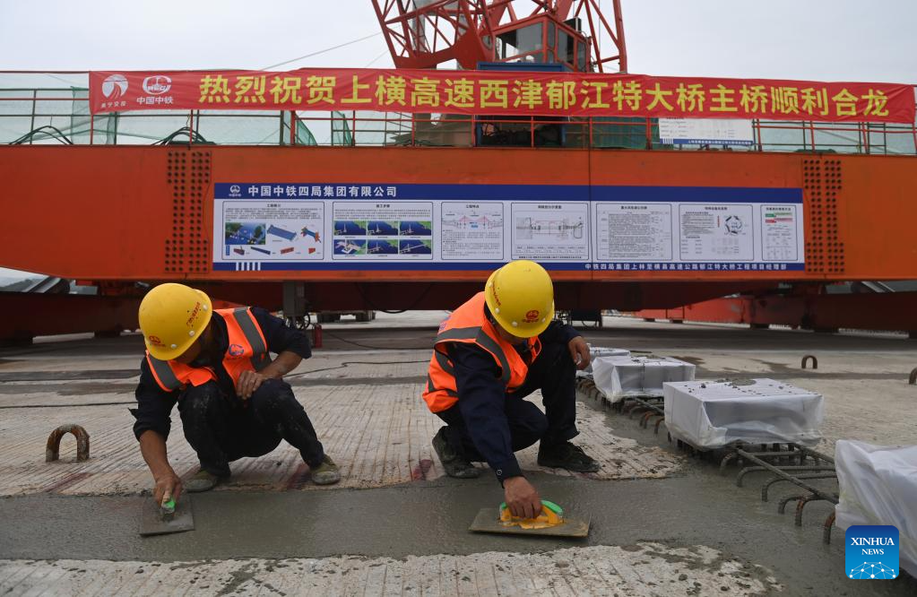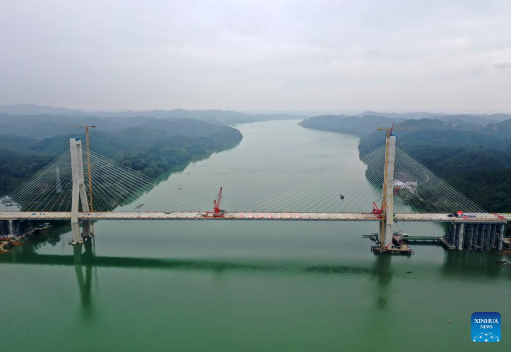 Workers work at the construction site of Xijin Yujiang grand bridge on Shanglin-Hengzhou expressway in south China's Guangxi Zhuang Autonomous Region, Dec. 10, 2023. The two sides of the 1,190-meter-long bridge were joined together on Sunday. (Xinhua/Lu Boan)