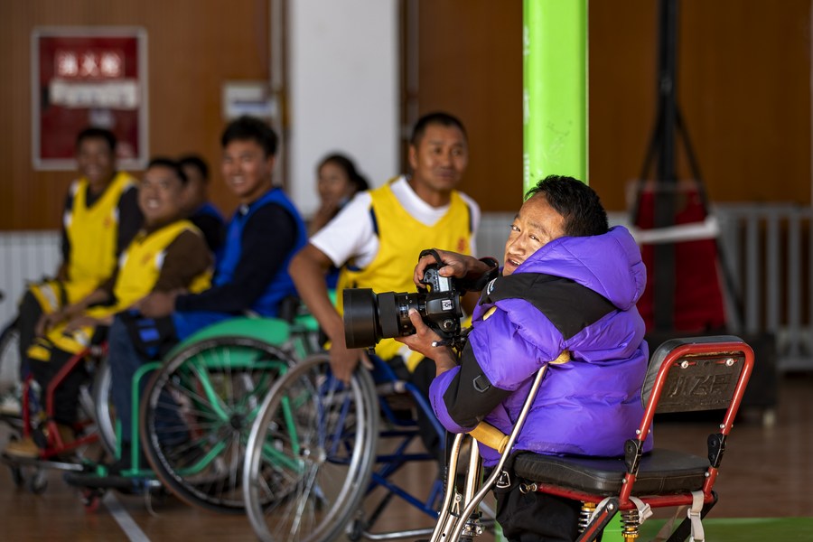 Lhapa Dondrup takes photos during a wheelchair basketball training session in Lhasa, southwest China's Xizang Autonomous Region, Nov. 26, 2023. (Xinhua/Jiang Fan)