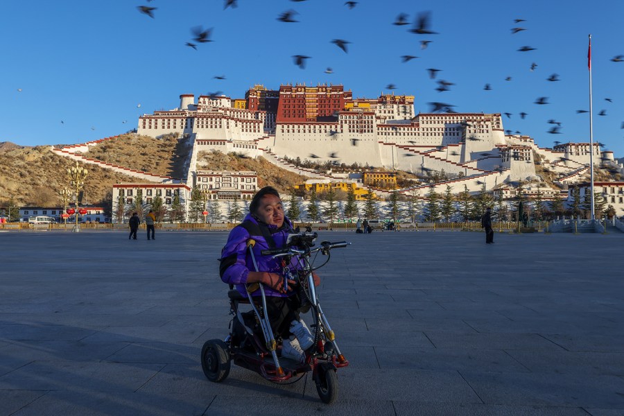 Lhapa Dondrup is pictured in front of Potala Palace in Lhasa, southwest China's Xizang Autonomous Region, Dec. 2, 2023. (Xinhua/Jiang Fan)