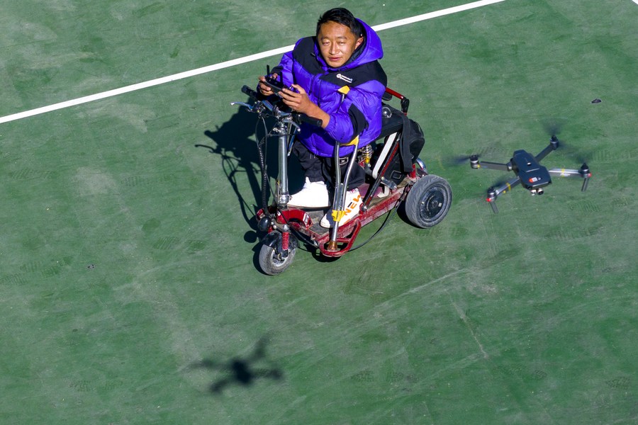 This aerial photo taken on Dec. 2, 2023 shows Lhapa Dondrup practicing the operation of a drone in Lhasa, southwest China's Xizang Autonomous Region. (Xinhua/Jiang Fan)