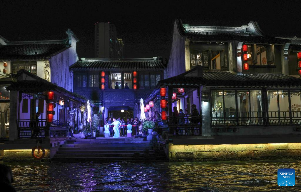 People dance at a historical and cultural district along the Grand Canal in Wuxi, east China's Jiangsu Province, Dec. 8, 2023. (Xinhua/Yang Lei)