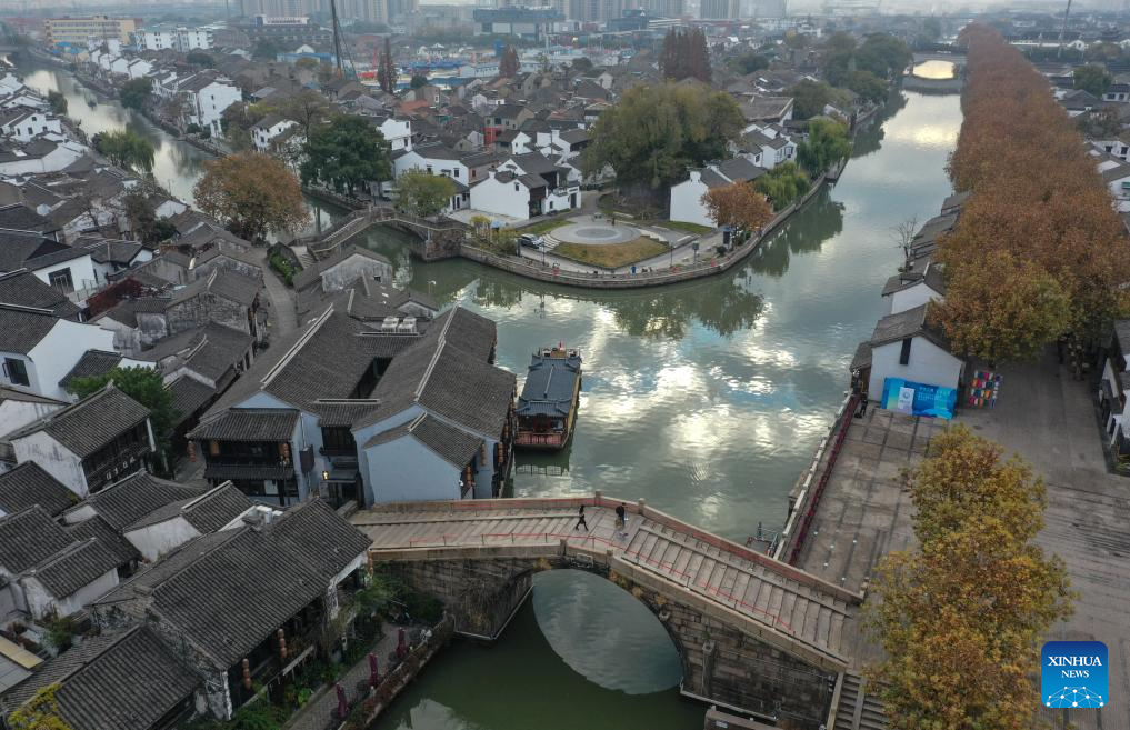 This aerial photo taken on Dec. 9, 2023 shows the view of a historical and cultural district along the Grand Canal in Wuxi, east China's Jiangsu Province. (Xinhua/Yang Lei)