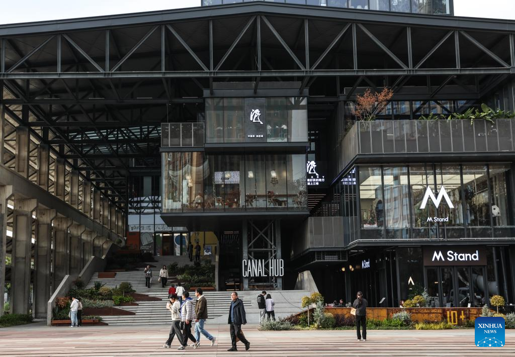 People visit a commercial area converted from an abandoned steel plant near the Grand Canal in Wuxi, east China's Jiangsu Province, Dec. 9, 2023. (Xinhua/Yang Lei)