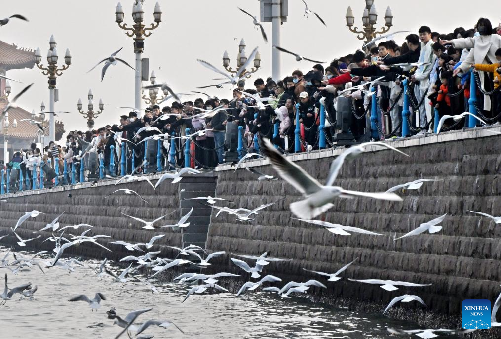 People watch seagulls at the Zhanqiao Bridge scenic spot in Qingdao, a coastal city in east China's Shandong Province, Dec. 9, 2023. (Xinhua/Li Ziheng)