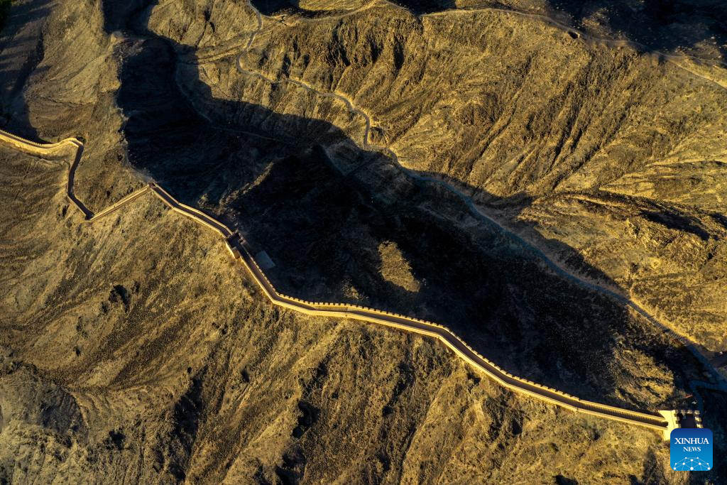 This aerial photo taken on July 16, 2023 shows a part of the Great Wall in Tianzhu Tibetan Autonomous County in Wuwei, northwest China's Gansu Province. Gansu Province is home to multiple sections of the Great Wall that add up to 3,654 kilometers in length. The Hexi Corridor, a critical part of the ancient Silk Road winding through south of the province, boasts more than 1,400 kilometers of the Wall built in the Han Dynasty (202 BC-220 AD), and over 1,200 kilometers erected in the Ming Dynasty (1368-1644). Gansu is therefore dubbed "an open-air museum of the Great Wall." (Xinhua/Liu Jinhai)