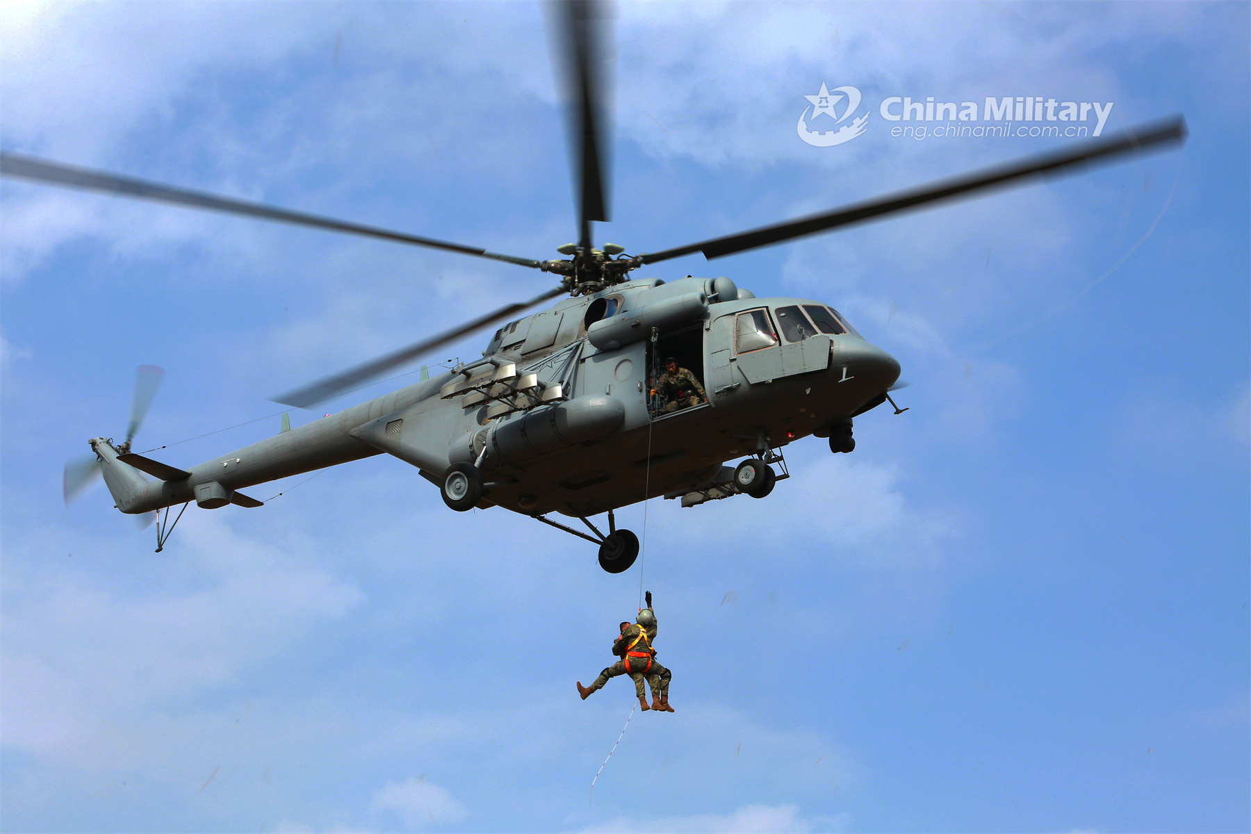A soldier assigned to an aviation brigade with the air force under the PLA Southern Theater Command picks up the "trapped" service member during a search and rescue training exercise held on November 1, 2023. (eng.chinamil.com.cn/Photo by Lei Jian)