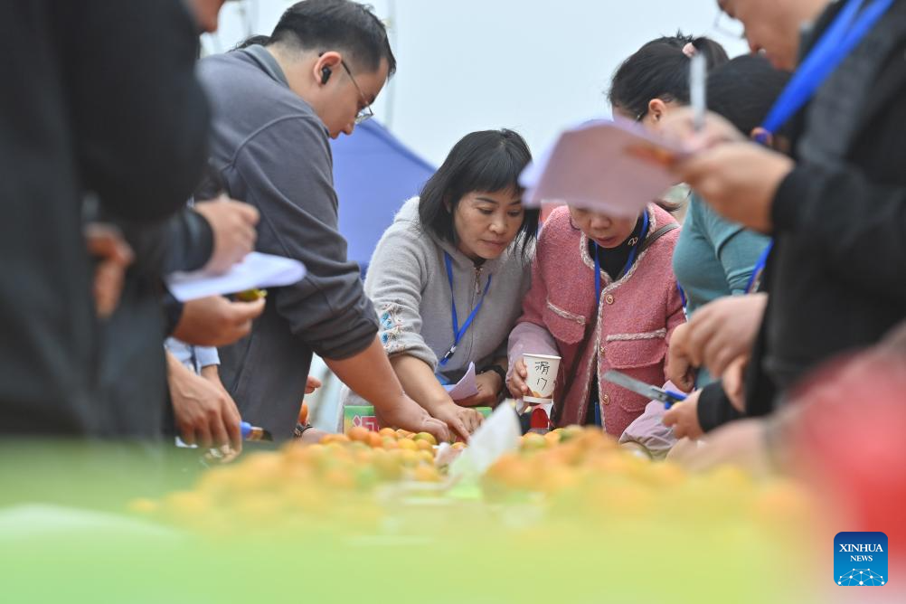 Judges perform comprehensive evaluation during a kumquat competition in Rong'an County, south China's Guangxi Zhuang Autonomous Region, Dec. 10, 2023. The kumquat planting has become a cash-cow business for local farmers in Rong'an. A total of 221,000 mu (about 14,733 hectares) of kumquat trees planted in the county this year are expected to yield 250,000 tonnes of kumquats. (Xinhua/Huang Xiaobang)
