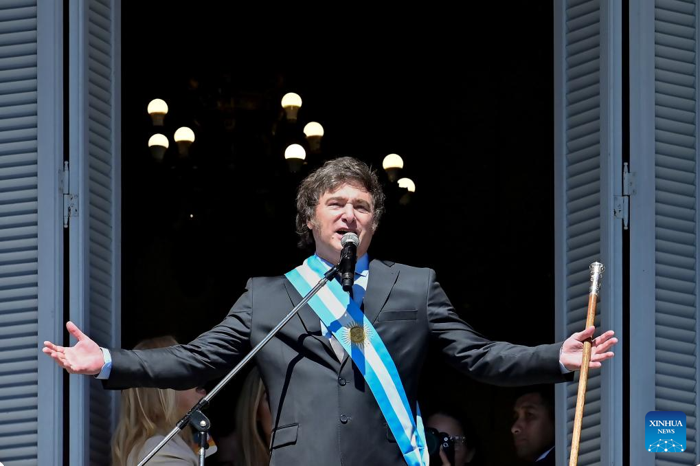 Argentina's new President Javier Milei delivers a speech to the crowd at a balcony of the Casa Rosada Presidential Palace in Buenos Aires, Argentina, Dec. 10, 2023. (Photo by German Adrasti/Xinhua)
