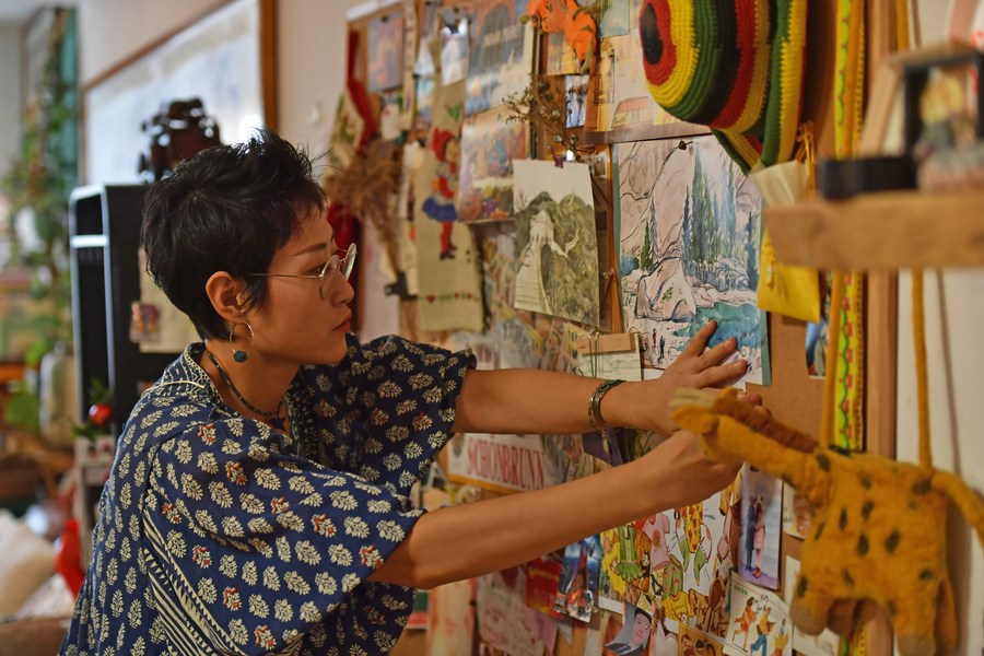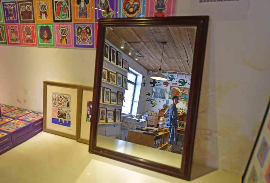 Jiang Yige sorts out cultrual and creative products at a gallery where she displays her works in Dandong City, northeast China's Liaoning Province, Aug. 22, 2023. (Xinhua/Yang Qing)