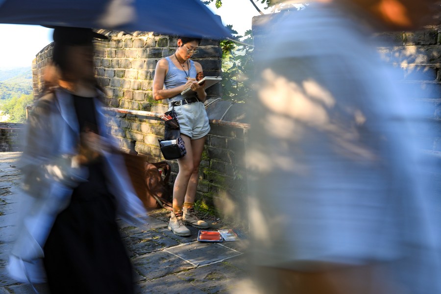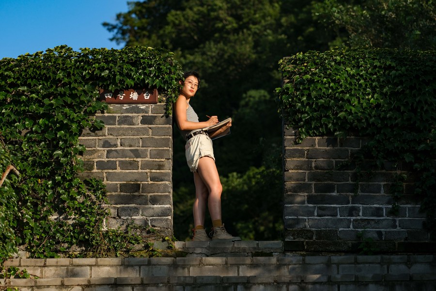 Jiang Yige creates a drawing at the Hushan section of the Great Wall in Dandong City, northeast China's Liaoning Province, Aug. 23, 2023. (Xinhua/Zhang Xinjing)