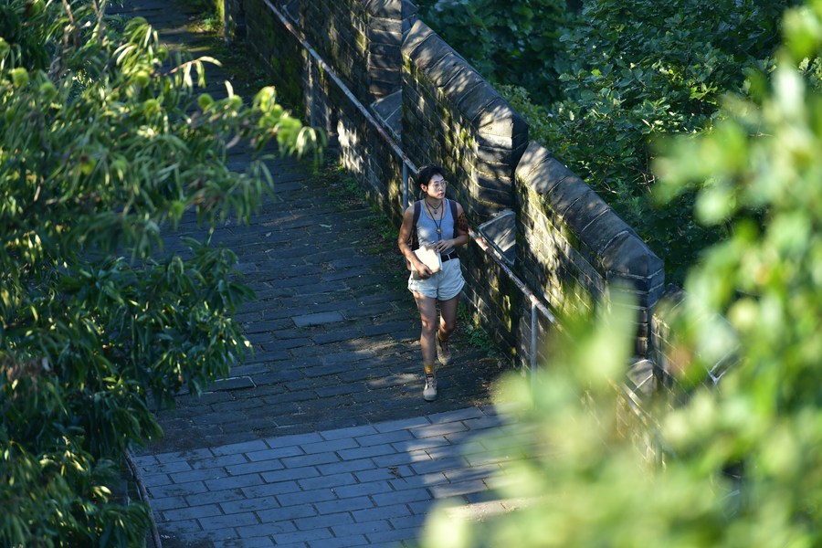 Jiang Yige visits the Hushan section of the Great Wall in Dandong City, northeast China's Liaoning Province, Aug. 23, 2023. (Xinhua/Yang Qing)