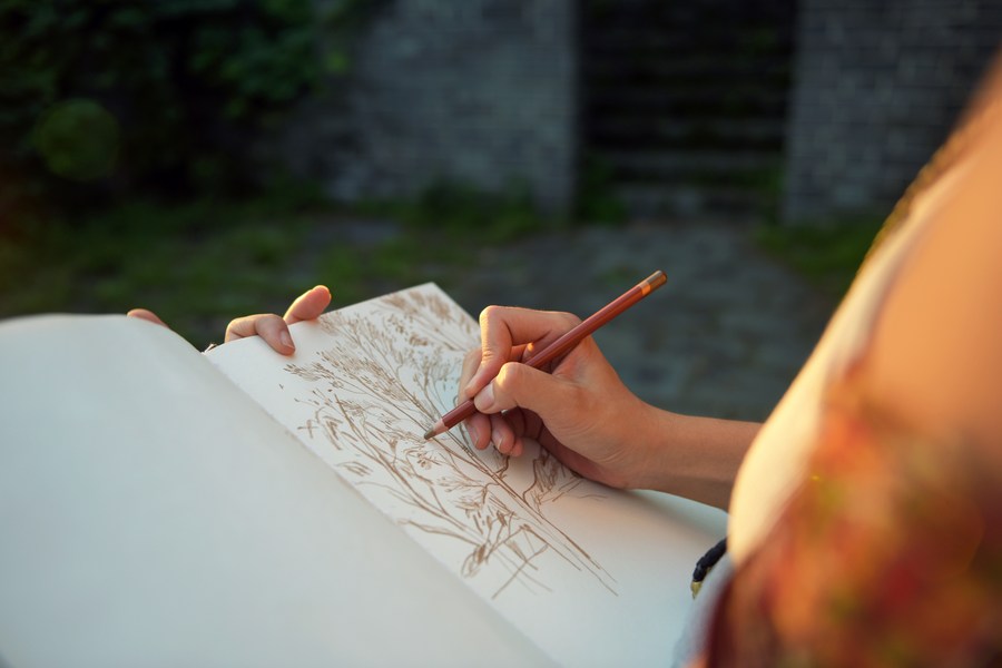 Jiang Yige creates a drawing at the Hushan section of the Great Wall in Dandong City, northeast China's Liaoning Province, Aug. 23, 2023. (Xinhua/Lu Zhe)