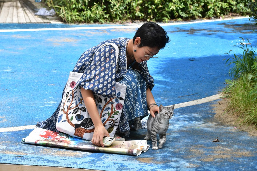 Jiang Yige interacts with a kitten at a residential compound in Dandong City, northeast China's Liaoning Province, Aug. 22, 2023. (Xinhua/Yang Qing)