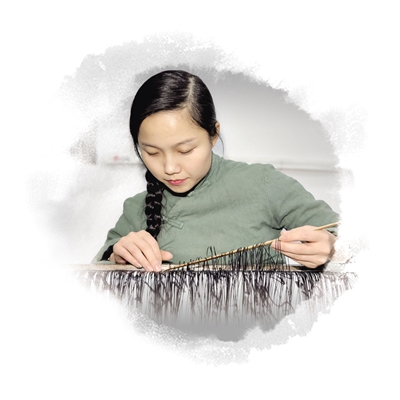 Yang Changqin, a provincial-level inheritor of Chishui's bamboo weaving craft, works on a bamboo-weaving painting. (Photo/Zhang Lang)