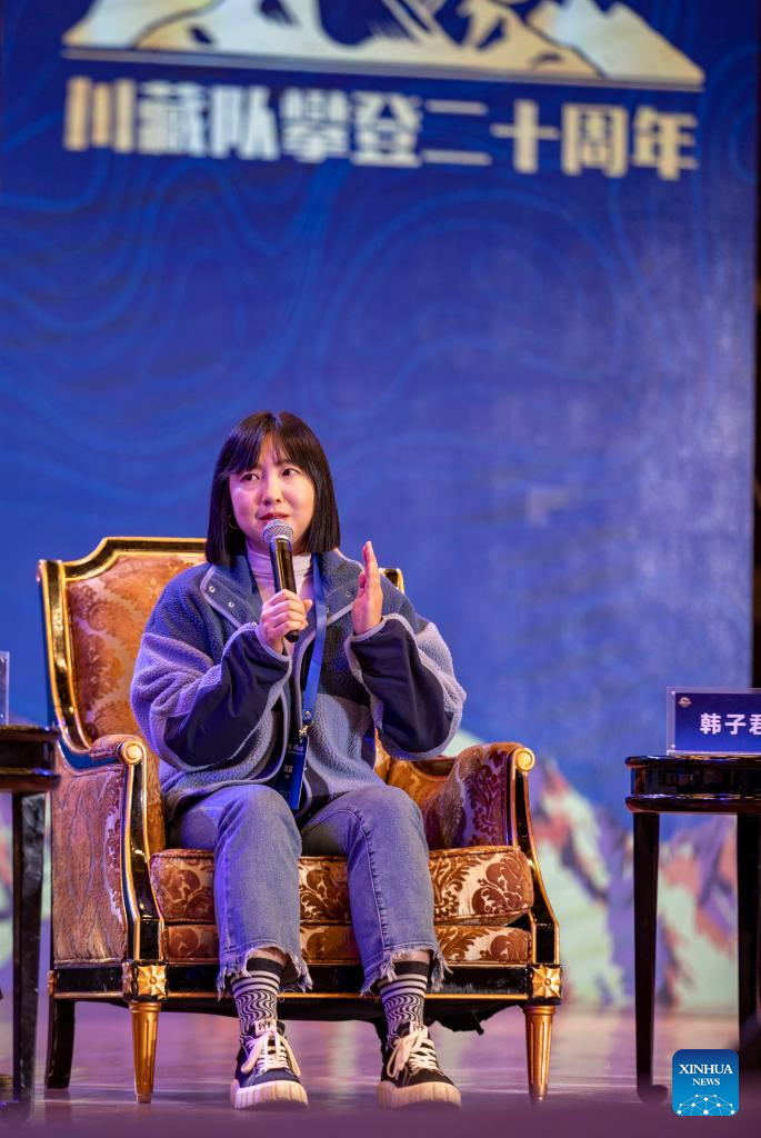 Mountaineer Han Zijun speaks during a meeting for Mount Qomolangma guides in Lhasa, southwest China's Xizang Autonomous Region, Dec. 11, 2023. A meeting for Mount Qomolangma guides was held in Lhasa on Monday. Experienced mountaineers shared their skills and stories to over 500 mountain guides, mountaineering enthusiasts and outdoor sports practitioners. (Xinhua/Huang Yaoman)