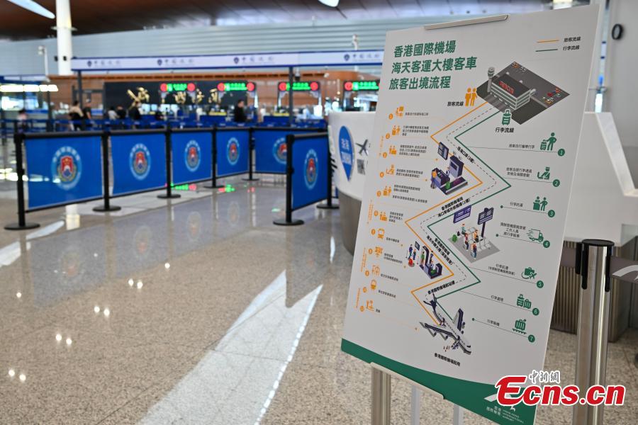 An introduction of the "Fly-Via-Zhuhai-HK" passenger transfer service is displayed at the Zhuhai Port of the Hong Kong-Zhuhai-Macao Bridge in south China's Guangdong Province, Dec. 11, 2023. (Photo: China News Service/Chen Jimin)