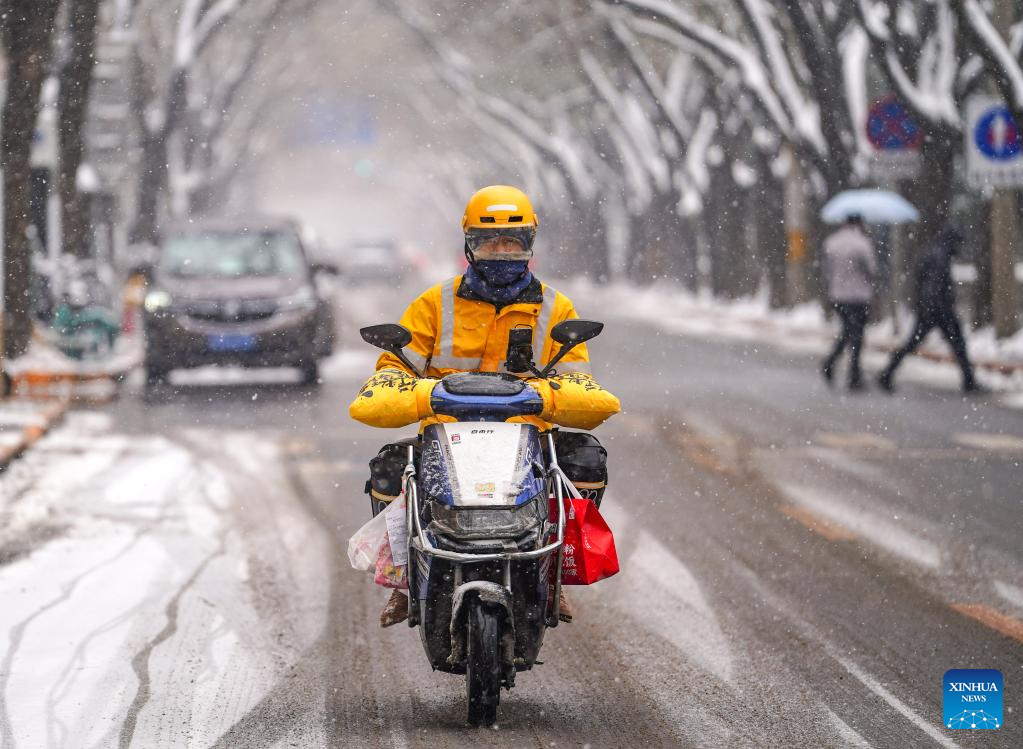 A deliveryman rides in the snow on Yangfangdian West Road in Beijing, capital of China, Dec. 13, 2023. (Xinhua/Chen Yehua)