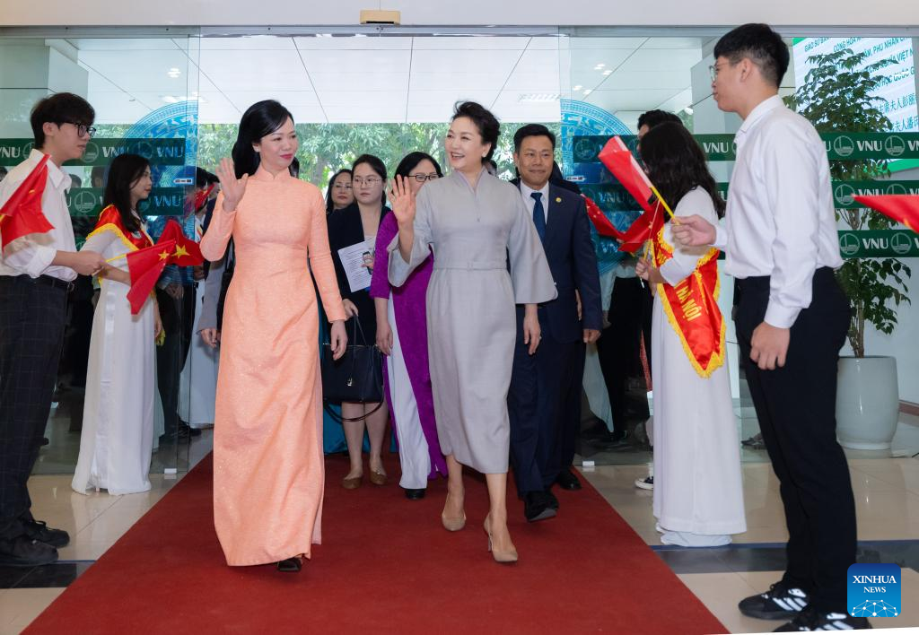 Peng Liyuan, spouse of Chinese President Xi Jinping, accompanied by Phan Thi Thanh Tam, spouse of Vietnamese President Vo Van Thuong, visits Vietnam National University, Hanoi, Vietnam, Dec. 13, 2023. (Xinhua/Zhai Jianlan)