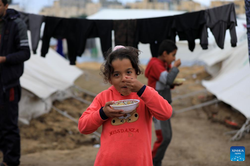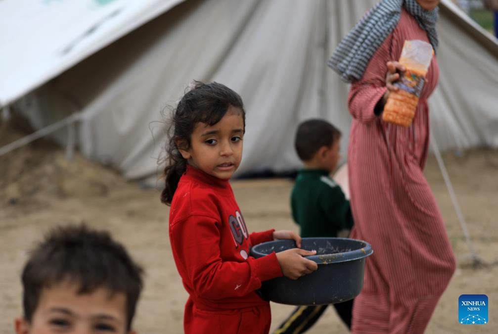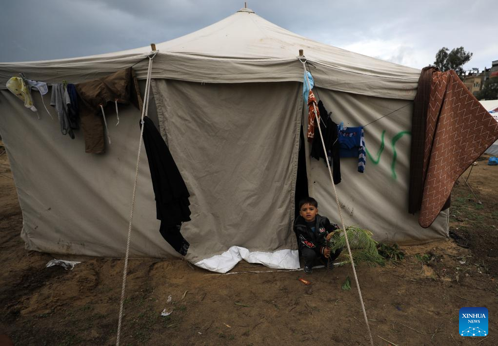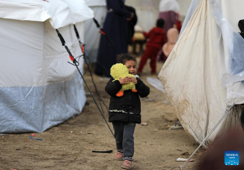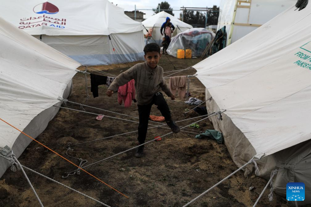 A Palestinian child is seen at a temporary shelter in the southern Gaza Strip city of Rafah, on Dec. 13, 2023. Hamas leader Ismail Haniyeh said on Wednesday that the Gaza-ruling Palestinian faction is ready to discuss with Israel any arrangement or initiative that could lead to a ceasefire in Gaza. (Photo by Yasser Qudih/Xinhua)