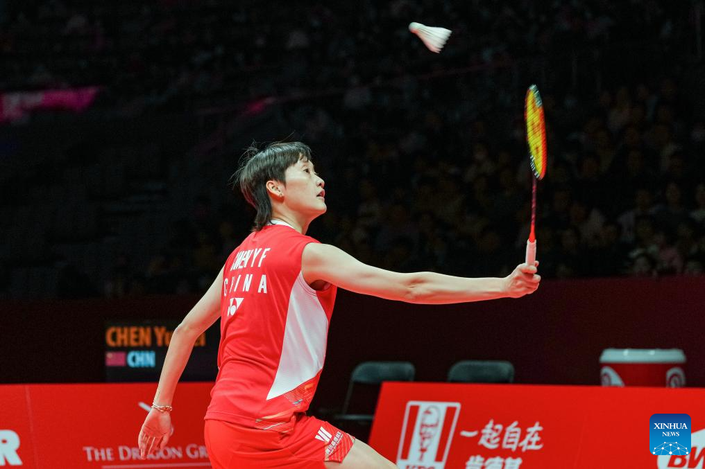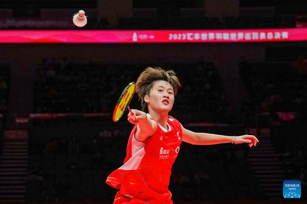 Chen Yufei competes during the women's singles group B match between Chen Yufei and Han Yue of China at BWF World Tour Finals 2023 in Hangzhou, China, Dec. 13, 2023. (Xinhua/Sun Fei)
