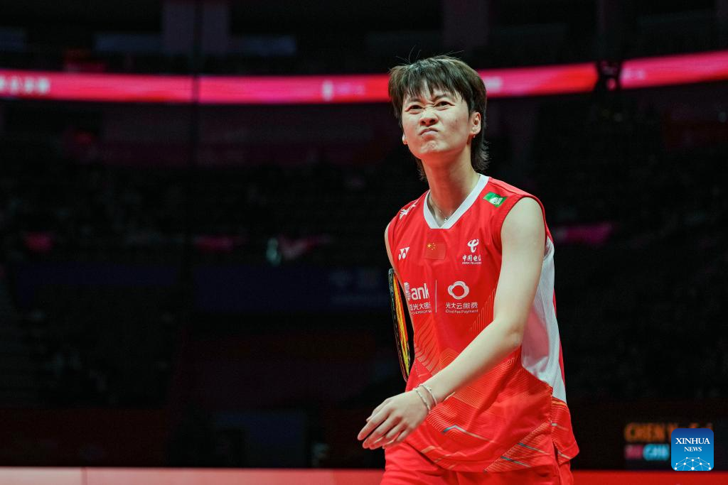 Chen Yufei reacts during the women's singles group B match between Chen Yufei and Han Yue of China at BWF World Tour Finals 2023 in Hangzhou, China, Dec. 13, 2023. (Xinhua/Sun Fei)