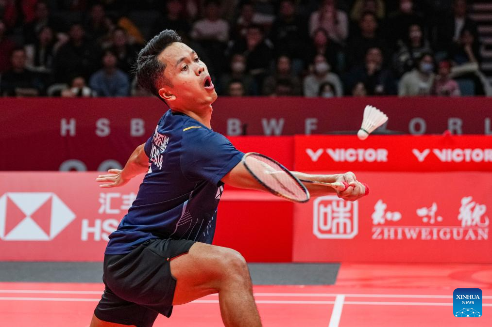 Anthony Sinisuka Ginting competes during the men's singles group A match between Naraoka Kodai of Japan and Anthony Sinisuka Ginting of Indonesia at BWF World Tour Finals 2023 in Hangzhou, China, Dec. 13, 2023. (Xinhua/Sun Fei)