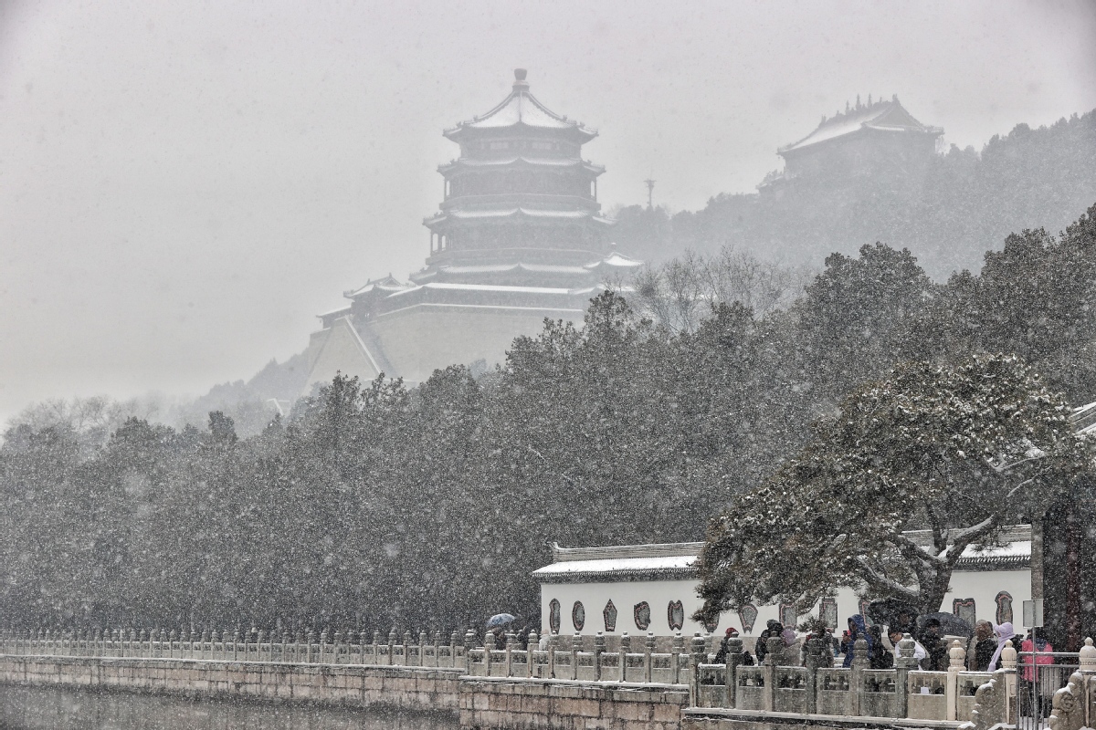 Residents in Beijing enjoy the first snow of the winter at the Summer Palace on Tuesday. [Photo by Jiang Dong/China Daily]