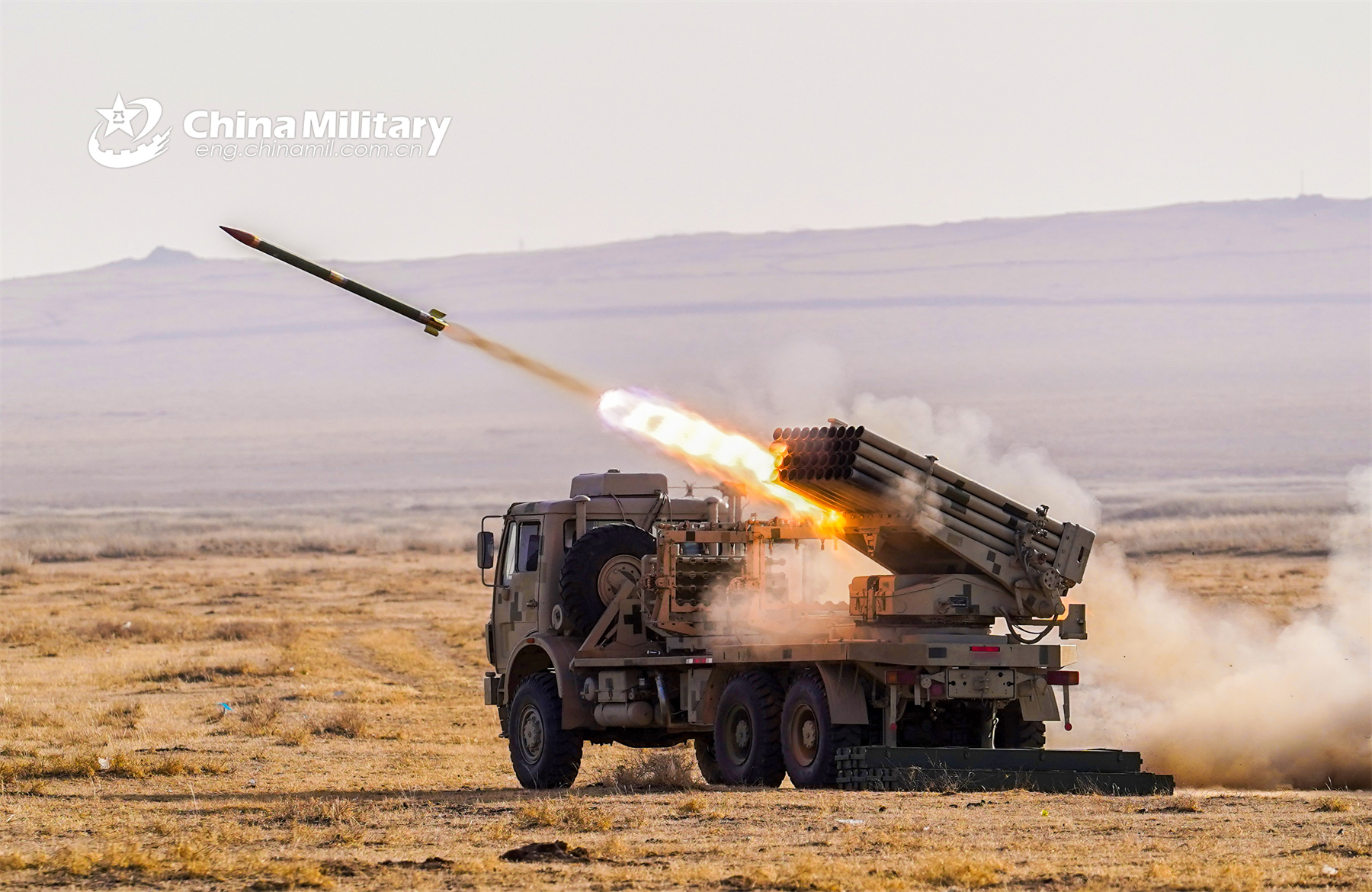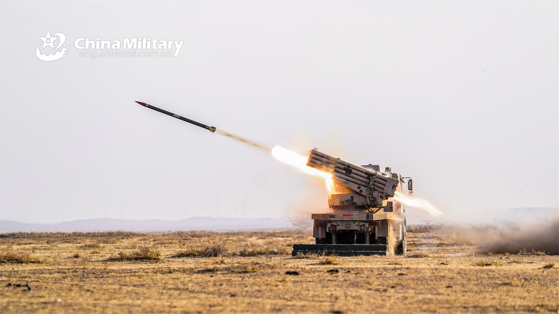 A vehicle-mounted mine-laying system attached to a brigade under the PLA 81st Group Army launches mine-loaded rockets during a live-fire training exercise in early December, 2023. (eng.chinamil.com.cn/Photo by Li Changxing)
