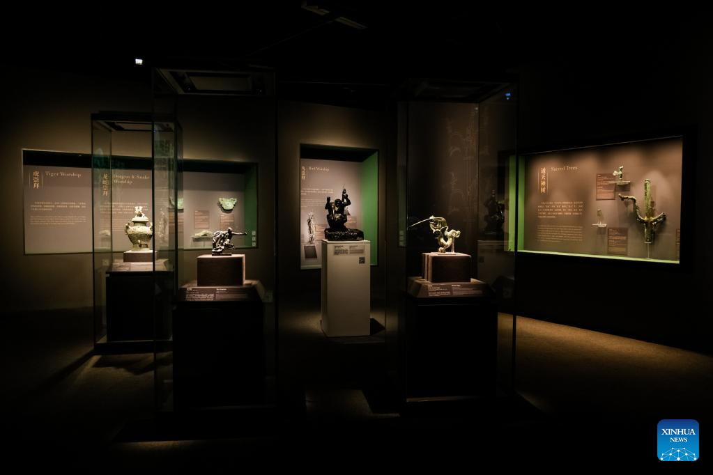This cellphone photo taken on Dec. 13, 2023 shows items displayed during an exhibition titled "Glory of Bronze Civilization" in east China's Shanghai. An exhibition featuring sculptures by the French sculptor Auguste Rodin and bronze relics from China's Sanxingdui Ruins opened in Shanghai on Wednesday, celebrating 60 years of diplomatic relations between China and France. (Xinhua/Sun Liping)