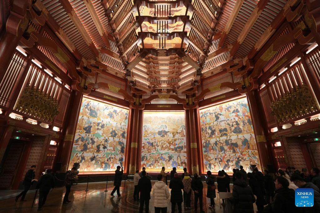 People watch sculptures at the Nishan Sacredland scenic spot in Qufu City of east China's Shandong Province, Dec. 13, 2023. The Nishan Sacredland scenic spot, located in Qufu City, started its construction in 2012 and opened its core area to the public in 2018. The scenic spot, a destination for exploring the Confucianism, received nearly 2 million tourists this year. (Xinhua/Wang Yuguo)