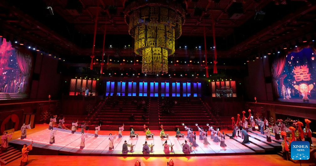 People watch a performance at the Nishan Sacredland scenic spot in Qufu City of east China's Shandong Province, Dec. 13, 2023. The Nishan Sacredland scenic spot, located in Qufu City, started its construction in 2012 and opened its core area to the public in 2018. The scenic spot, a destination for exploring the Confucianism, received nearly 2 million tourists this year. (Xinhua/Wang Yuguo)