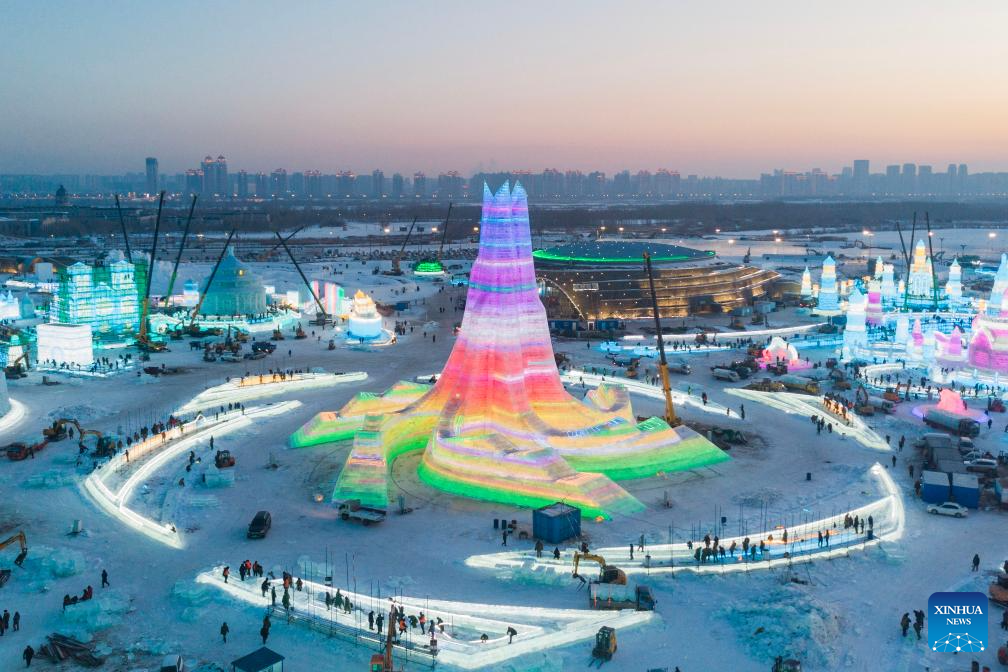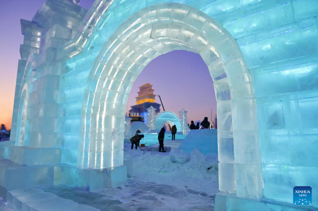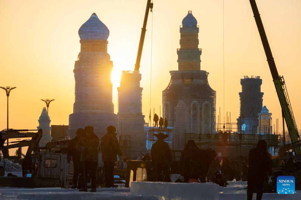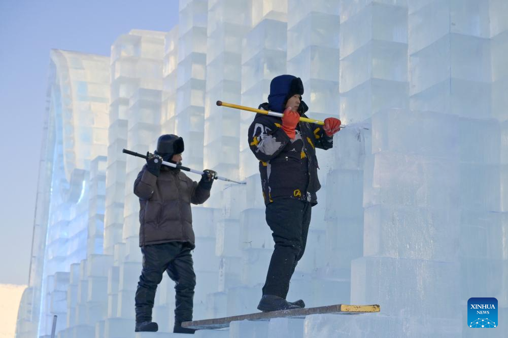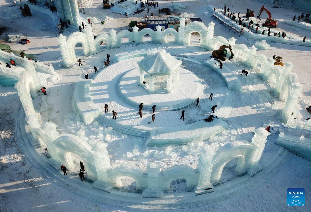 Workers are seen at the construction site of the Harbin Ice and Snow World, a renowned seasonal theme park opening every winter, in Harbin, northeast China's Heilongjiang Province, Dec. 12, 2023. Harbin Ice and snow World will open for its 25th winter season on Dec. 18. It is estimated that 250,000 cubic meters of ice and snow will be used in its construction. (Xinhua/Zhang Tao)