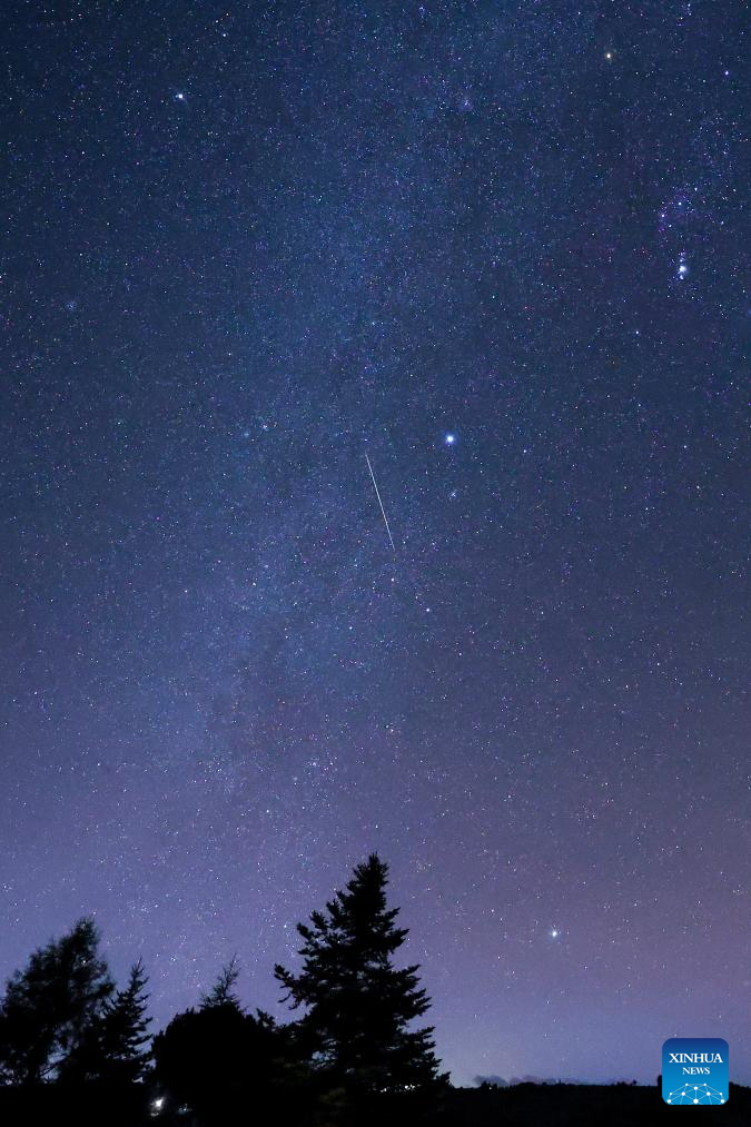 This photo taken on Dec. 15, 2023 shows Geminids meteor shower over Yulong County, Lijiang City, southwest China's Yunnan Province. (Xinhua/Cui Wen)