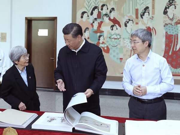 President Xi Jinping visits exhibitions of relics and research results and attends a symposium with experts, scholars and representatives from cultural units in the Dunhuang Academy in Dunhuang, Gansu province, Aug 19, 2019. [Photo/Xinhua]