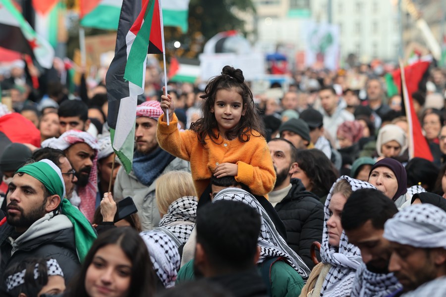 People take part in a demonstration in Brussels, Belgium, Nov. 11, 2023, calling for an immediate ceasefire in Gaza Strip. (Xinhua/Zhao Dingzhe)